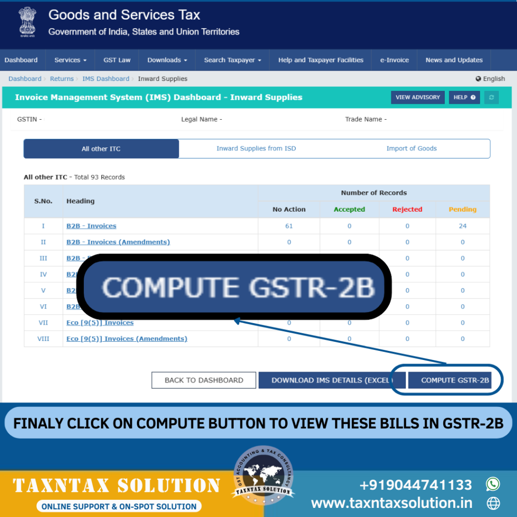 SAVE करने के बाद, प्रक्रिया को पूरा करने के लिए Compute बटन पर क्लिक करें। यह चरण आपकी ITC कैलकुलेशन को सुनिश्चित करता है और आपकी GSTR-2B में इनवॉइस की स्थिति को अपडेट करता है।