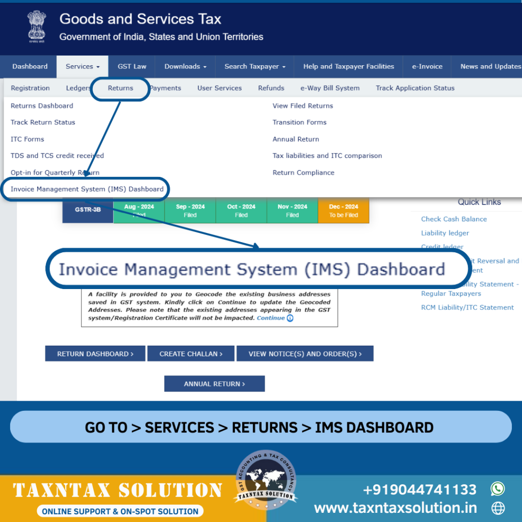 Returns Menu में, Invoice Management System (IMS) बटन पर क्लिक करें। यह बटन आपको IMS विंडो में ले जाएगा, जहां आपको अपने इनवॉइस की स्थिति को अपडेट करना होगा।